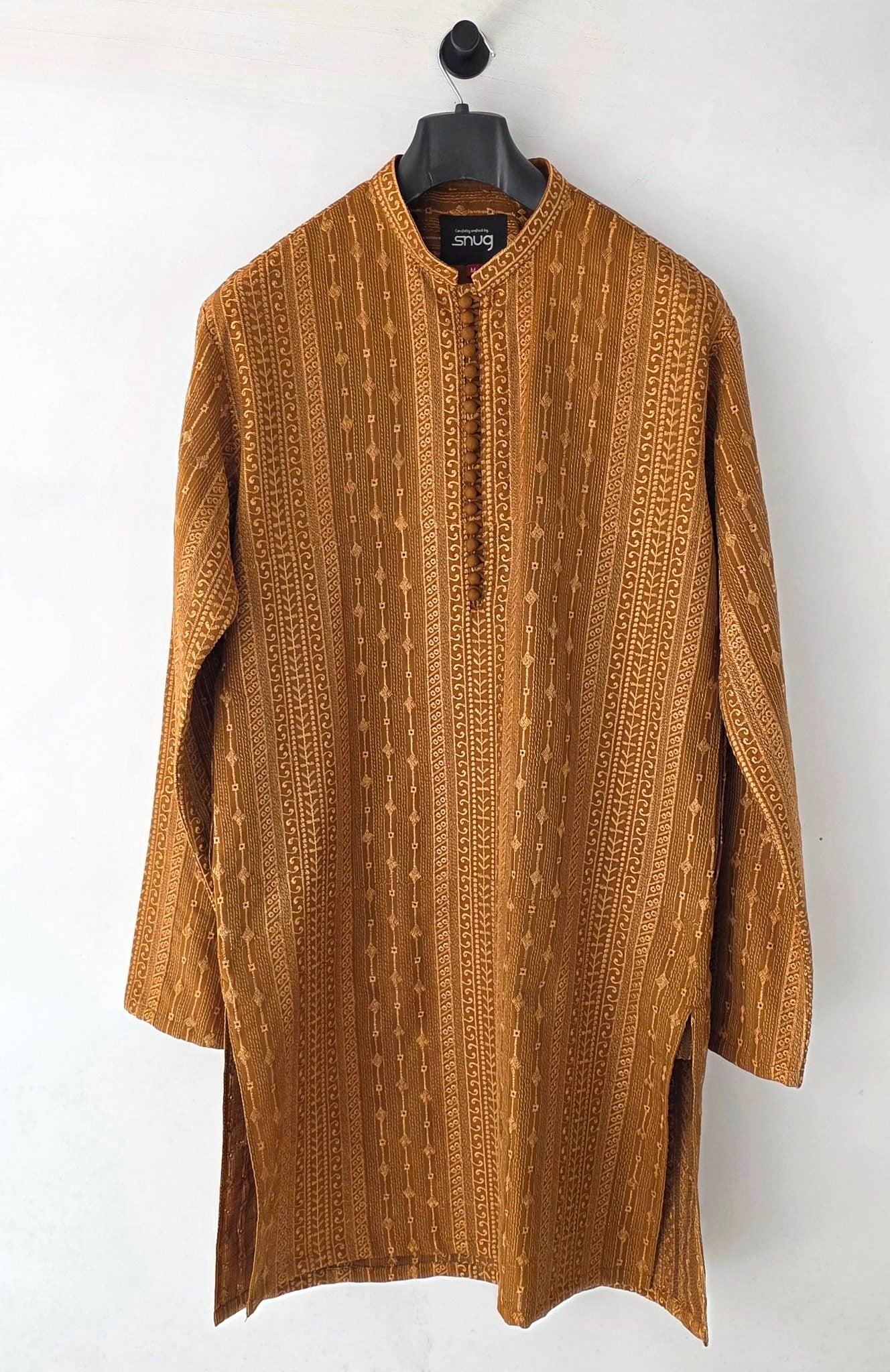 A stylish Mustard Brown Embroidered Kurta Trouser Set, designed with premium fabric and elegant embroidery for a refined traditional look. Ideal for Ramzan, Eid, weddings, and festive occasions, this outfit offers both comfort and timeless appeal.